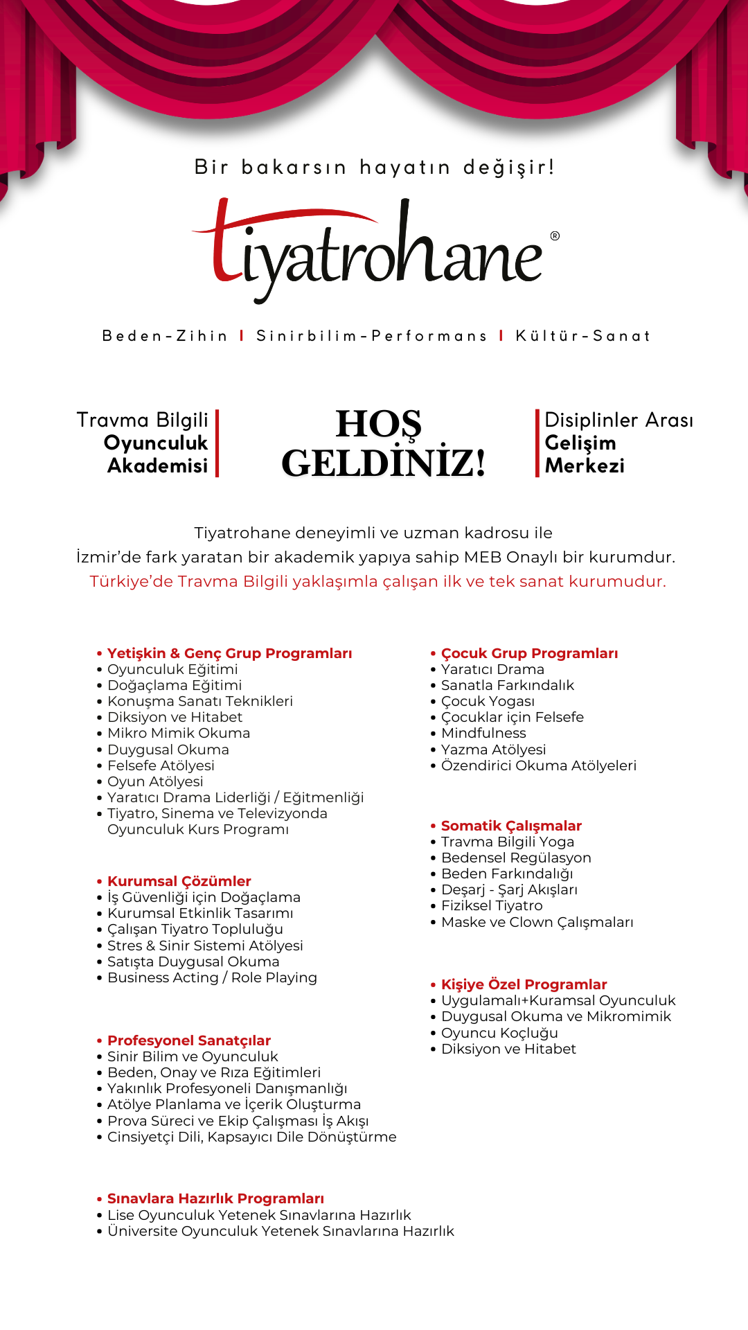 2019 yılından beri üzerinde çalıştığımız “Travma Bilgili Oyunculuk®” uygulamalarının 2022 yılı itibariyle içeriğimize dahil edildiğini duyurmaktan gurur duyuyoruz!